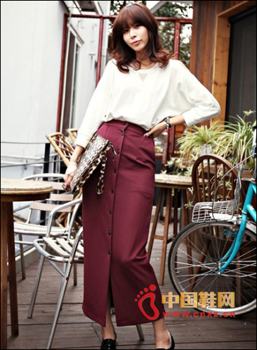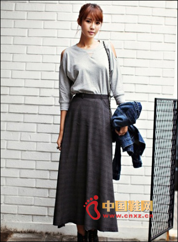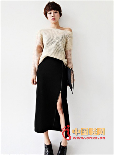 修身的針織長裙,偏側的拉鏈開襟很有魅力,可以不區分前后,將拉鏈裝飾在前面或者后面都OK。拉鏈也可以稍微打開一點穿會很性感。寬松毛衫配長裙,是一個不錯的搭配組合。