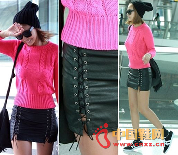 若想要既休閑又有帥氣的感覺,可以選擇有鉚釘和捆綁的設計。皮裙與黑白上衣相搭體現男孩風,或與粉紅色、紅色上衣搭配展現出女人味兒的時尚氣息,也是不錯的穿搭方式。