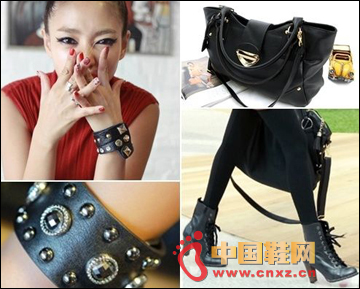 混搭鉚釘或鑲鉆的皮革手鏈、項鏈呈現華麗感,或者利用短靴凸顯懷舊感也是個很好的方法。喜歡OL辦公裝或正裝的人士還可以用黑色皮包增添酷感。