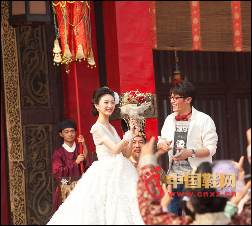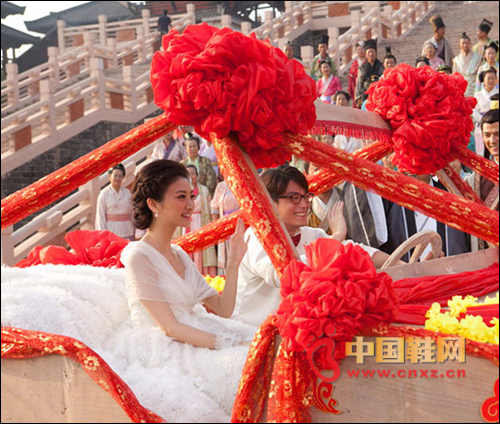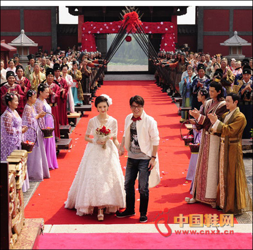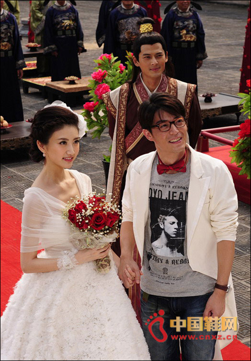 在昨天的“皇家婚禮”上,景甜和霍建華在一眾唐朝古人的簇?fù)硐马樌昊椤R驗(yàn)樘瞥瘺]有現(xiàn)代的時裝面料,追求細(xì)節(jié)的導(dǎo)演林子聰特別選取了古代的綢緞和薄紗,專程到香港定做了景甜和霍建華的“復(fù)古”結(jié)婚禮服。然這場古代婚禮卻并沒有出現(xiàn)大家耳熟能詳?shù)陌颂Т筠I、鳳冠霞披、夫妻拜堂。隨著小宮女一聲嘹亮的“新娘子到!”,踏入古色古香“禮堂”的景甜居然穿著長達(dá)5米,重達(dá)30余斤的純白抹胸婚紗蹬著高跟鞋華麗登場,與一旁身穿白色燕尾服卻搭配牛仔褲休閑鞋的霍建華堪稱史上最“穿越”的一對新人。最值得一提的是,景甜身穿的“超級婚紗”,裙擺的立體鮮花全部由手工縫制完成,整件婚紗重達(dá)30余斤,總長度超過5米。這讓景甜直呼真是一件‘甜蜜的負(fù)擔(dān)’。”而“宅男”霍建華也慘遭導(dǎo)演惡搞,白色燕尾服下面卻穿著T恤牛仔褲和休閑鞋,還附帶電子手表、粗框眼鏡和大紅的蝴蝶領(lǐng)結(jié)。極度“混搭”的穿衣風(fēng)格令他場獲贈新外號:“手表、領(lǐng)結(jié)加眼鏡,華叔已經(jīng)變身成名偵探柯南了。”