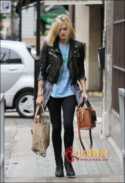 Fearne Cotton :為簡(jiǎn)單隨意的紅T恤和牛仔褲配上一件黑色皮衣就很酷。