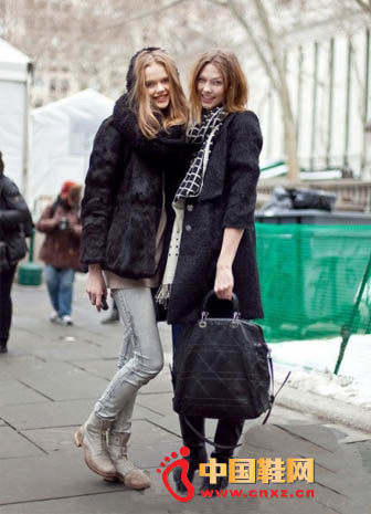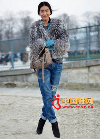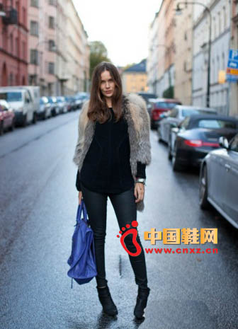 皮草一直是奢華的代名詞,黑色皮草外套內搭裸色衫成熟穩重中帶著點奢華,一條緊身淺色牛仔褲和皮靴秀出好身材又迷彌補上身的臃腫。