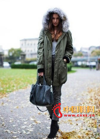 雨衣質感的外套獨特毛質帽子糖整件衣服充滿質感,搭配上低調的花紋長褲和高跟皮靴修長而高挑,秋季這身搭配不敢說是最時尚的但絕對是最有味的。