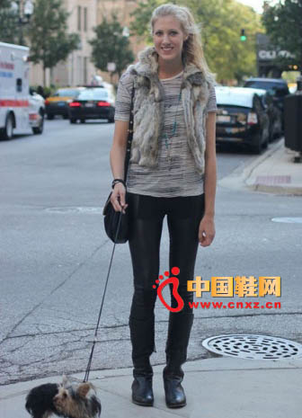 皮草的灰色的小馬甲搭配灰色的條紋T恤衫,更加整體和諧,黑色的緊身褲搭配黑色皮靴,時尚硬朗。