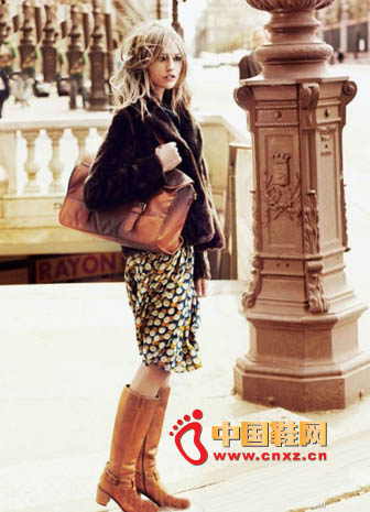 深褐色皮草西服外套精致優雅,搭配上印花連衣裙凸顯MM的淑女氣質,復古包包和皮靴的選擇吐露出西西里情節。