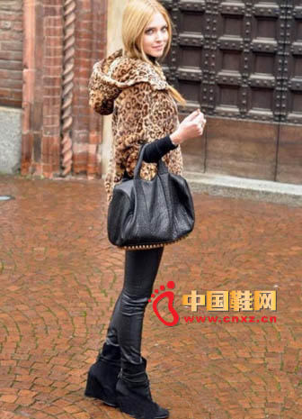 性感的豹紋皮草外套,搭配黑色皮質緊身褲,性感時尚,一雙黑色高跟鞋,性感魅惑。