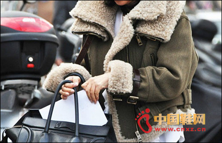 一向冷酷利落示人的軍裝機車夾克,居然和毛茸茸的棉毛結合在一起,不得不驚嘆設計師的鬼才。雙層大領把視覺直接拉到頸部以上,袖口和下擺做簡單的相應。如此風格再加一個又利落又圓潤的手拎包最好不過了。