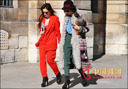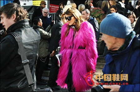 這飄逸和色彩表現到極致的枚紅色長毛外套真是夠搶眼,只求保暖的“愛斯基摩”式只能黯然無光的站在一邊自嘆不如了。如此高調絢麗的色彩徹底顛覆了人們對皮毛的刻板印象,原來除了暖黃色,深冷色,還可以如此華麗麗。再配以黑超,搭上黑色腰封,經典的黑色打底褲,看,花甲老人都被你深深吸引了。