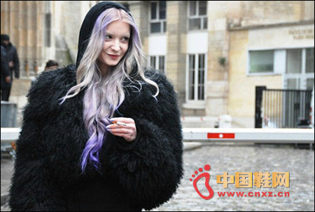 本是大黑熊賣點的皮毛外套,雖然夠震撼夠有氣場,可是搭配不好容易給人“黑熊來了”的視覺抵觸。然而精彩的是這位姑娘一頭白色的長發,以及發梢冷艷的紫,配以鮮艷的紅唇。瞬間“黑熊”變身妖嬈“狐媚”。絕對有沖擊力的視覺碰撞,潮兒滿分。