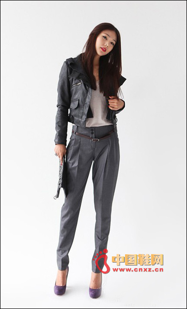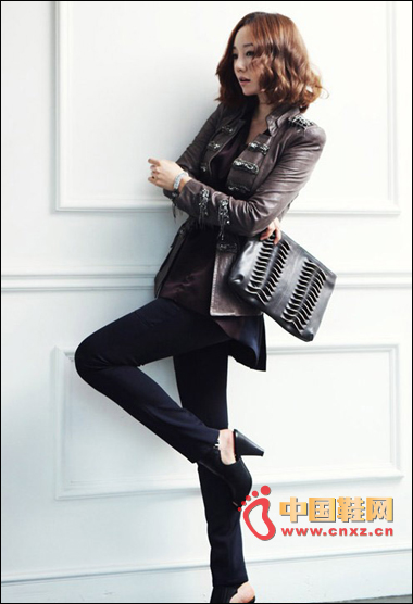 同色系的服裝讓我們免去了配色的煩惱,一款深棕色小皮夾克搭配一條高腰制服褲,在高跟鞋的襯托下更顯9頭身比例。