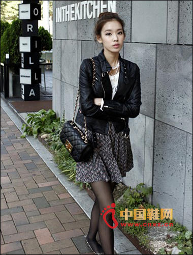 黑色皮衣與碎花裙的組合經久不衰,絲襪與平底鞋讓你可以舒服的一邊逛街一邊展現美腿。