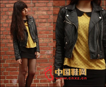 黃色的圓領上衣是今年學院風的服飾中最常見的款式,圓點的設計與黑色的翻領,盡顯乖巧甜美的感覺。將圓領上衣與黑色皮衣搭配,混搭的方法讓不同風格的服飾碰撞出火花,制造出非同尋常的感覺。搭配一條黑色的窄裙,穿上性感迷人的黑色絲襪與短靴,讓甜美、個性與性感同時展現,黑色皮衣搭配也極具誘惑力。