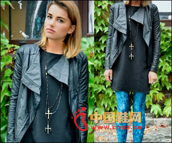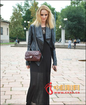 黑色皮衣也是非常百搭的單品,像這樣搭配黑色的雪紡長裙,優雅大方又散發出迷人的氣息,非常特別。