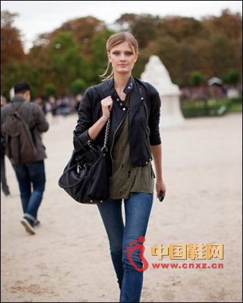 短款的黑色皮衣搭配軍綠色的T恤,打造出層次感,而牛仔鉛筆褲與短靴的搭配也是秋冬季潮流時尚的穿法。