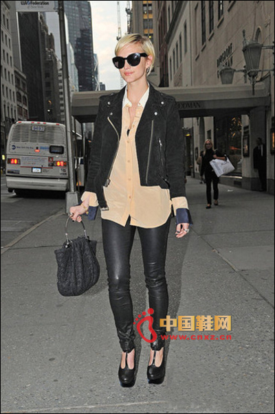 大美女Ashlee Simpson十分有新意地將機車外套搭配雪紡襯衫,硬朗風與柔美風的強烈沖撞讓整體造型很抓人眼球,黑色皮褲和高跟鞋則是造就朋克風的不二單品。