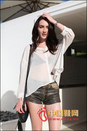 做舊磨皮的質感短褲帶來清爽性感的感覺,白色透視雪紡襯衫更是讓人眼前一亮,女孩子看了都會面紅耳赤,更何況是男孩子,很襯皮膚顏色和身材的搭配,既成熟又有鄰家女孩清新感,少女轉向熟女過度的最好搭配。