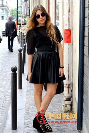 黑色的大褶小皮裙是街拍的常見座上賓客,光腿搭配裸靴是最佳的選擇,當然要在你對自己的腿相當自信的情況下,不然就很容易顯成又短又粗的小蘿卜腿。黑色的輕薄質地上衣是首選,斜跨的皮包也可以給整身裝扮加分哦。