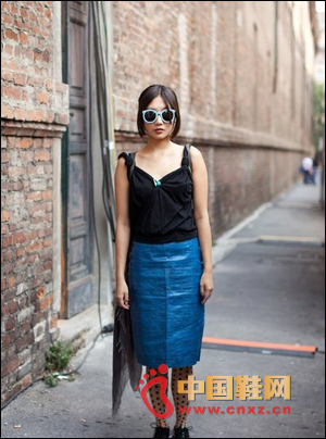 沒錯,皮裙也可以古著。只要在選材和款式上下一番功夫就有出現意想不到的結果。孔雀藍色的中裙配上波點的黑絲,既不那么誘惑也有幾分嬌媚在里面,復古眼鏡做配飾更點明了這身搭配的主旨。