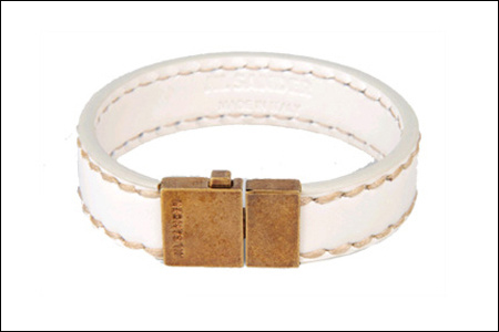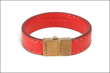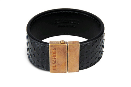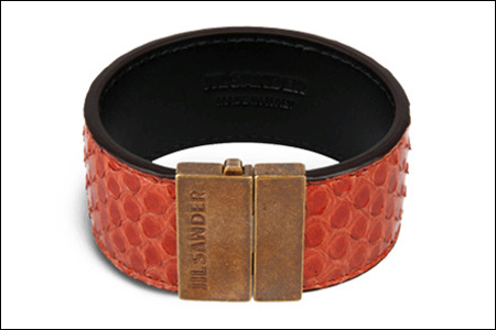 Jil Sander 2011秋冬的這五件手環除了經典的黑白色還有絢麗的橘紅色。皮革搭配做舊金屬的設計個性十足,而兩款蛇紋的壓花皮革處理更讓佩戴者多了一絲絲小性感。