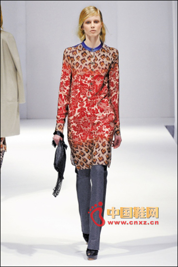 用亮色的獸紋雪紡連衣裙搭配簡單長外套,頗有復古之味