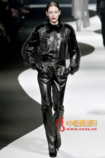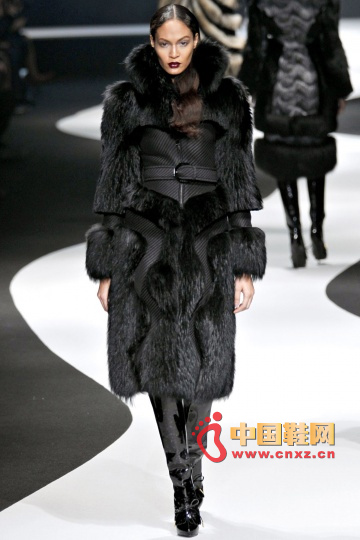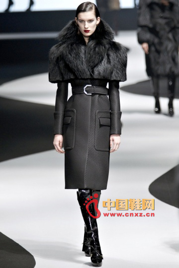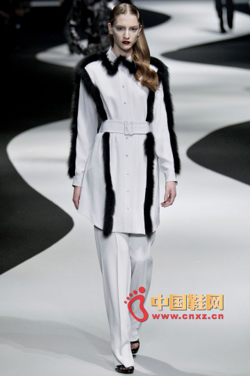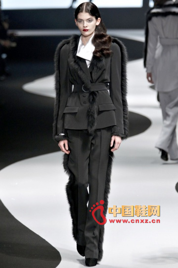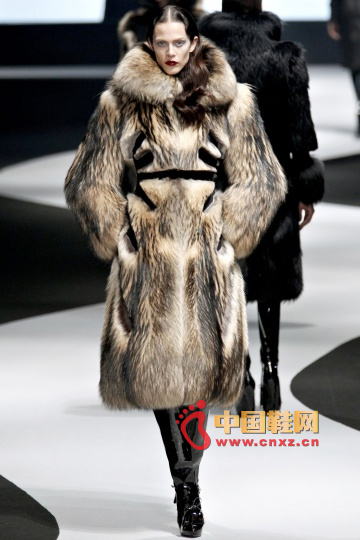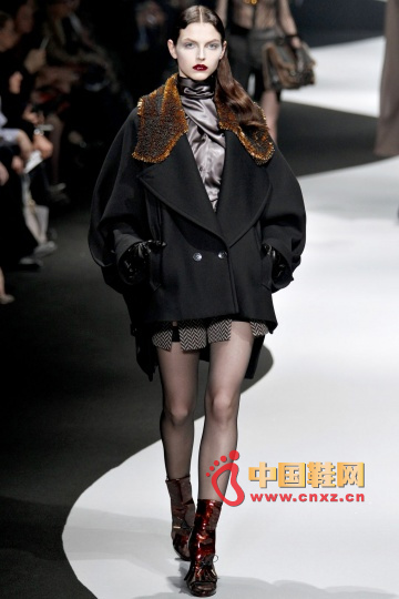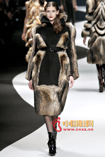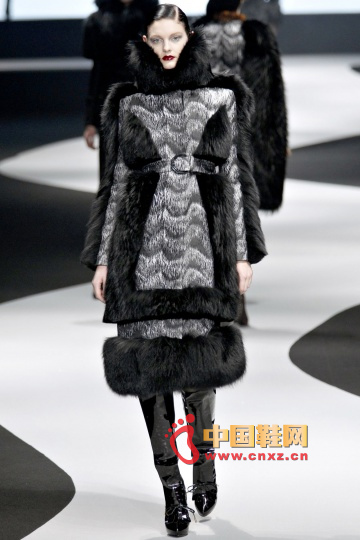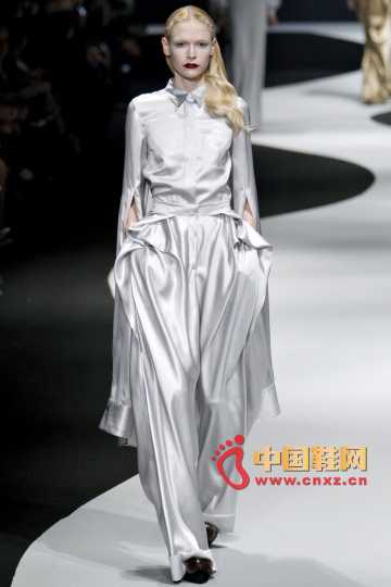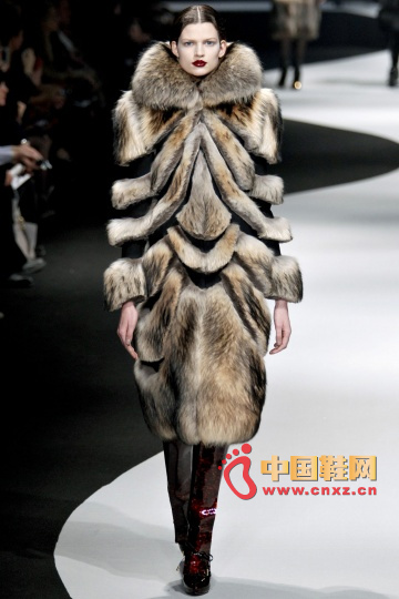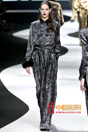 性感的透視蕾絲衫上不僅有女人味十足的立體花朵,荷葉邊和少許皮毛的點綴也唯美浪漫,柔軟而泛著淡淡金屬光澤的絲質睡衣式連身褲有著說不出的淡定和優雅。當然,這一季最大的看點還在于皮草的運用,從外套的寬大輪廓你可以看出Viktor & Rolf的典型風格,只是這一季更為收斂,皮草的間斷式點綴形成錯落豐富的層次感,強大的氣場呼之欲出。這樣既有型又實穿的Viktor & Rolf讓人怎么能拒絕呢?