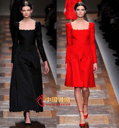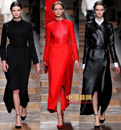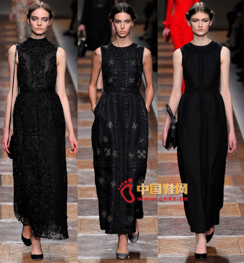 秋季,設(shè)計(jì)師通過(guò)這些甜美而女人味十足的廓形編織了一個(gè)迷人的環(huán)游地球的童話(huà),而這些廓形是在他們前幾季成衣與高級(jí)時(shí)裝作品中確立下來(lái)的。Pasolini 的電影《美狄亞》也是靈感來(lái)源之一,另外還包括其他一些來(lái)自電影、評(píng)論和現(xiàn)實(shí)生活中的身著民族服裝的女性圖片。一件白底開(kāi)襟長(zhǎng)裙上紅線(xiàn)和藍(lán)線(xiàn)繡上民族圖案——可能來(lái)自俄羅斯,又或許是希臘,也許兼而有之。而另一件作品所采用的密集編織提花面料,看起來(lái)則像是一條東方風(fēng)情的地毯。這些作品融合了很多手工技藝,卻并不實(shí)用。實(shí)際上,黑色皮革擴(kuò)寬了這對(duì)設(shè)計(jì)師二人組所熟悉的連衣裙和連衣褲的設(shè)計(jì)視野,它因?yàn)榱魈K和珠綴裝飾而變得格外柔和。