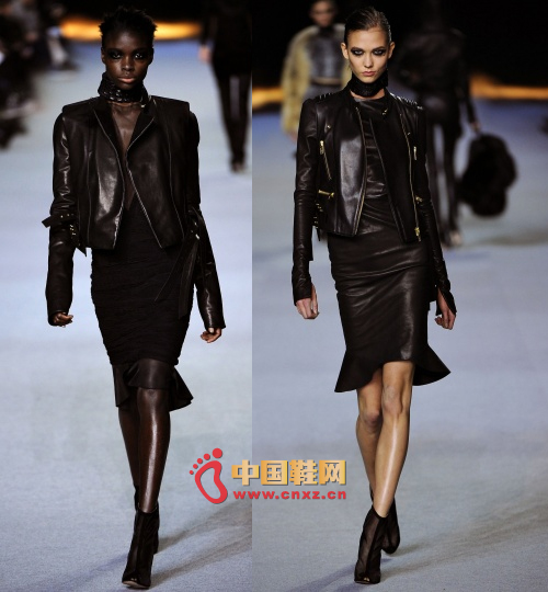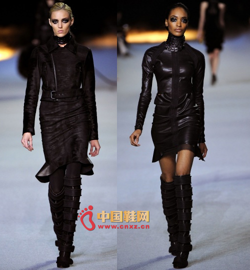 如果說 West 上季的處女秀缺乏明確的主題,那么這次的時裝秀則克服了這個缺點。West這次主要以皮革、天鵝絨、俄國羔皮為原材料,以黑色為主色調,以緊身褲和輪廓纖細的鉛筆裙為主打款式。West 想通過這場秀證明自己的設計能力正在不斷提升。軍樂、煙熏妝、角斗士的戰靴、怪異的鱷魚領都成為了他展示修煉成果的道具。整場秀編排的非常緊湊,圍繞著主題有序上演。總體來說,West 的設計還是有些亮點的:比如對爛花的運用、更為寬松的汗衫和最后一套服裝中出現的緊身外套。