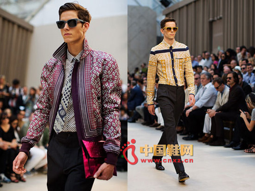受到藝術(shù)家David Hockney的影響,Christopher Bailey讓出場(chǎng)的基本款襯衫點(diǎn)綴上熒光色領(lǐng)子,金屬質(zhì)感十足;隨后展出的各式粉色、綠色、紫色的熒光襯衫和風(fēng)衣,讓品牌更為年輕化;同時(shí),春夏男裝也運(yùn)用了不少碎花格紋圖案,版型則是以八十年代為原型,Vintage風(fēng)席卷了整個(gè)伸展臺(tái);接近秀尾,極簡(jiǎn)短款飛行夾克,廓形寬闊立體,仿佛營(yíng)造年輕男人也可以有可靠肩膀的形象,重塑男人安全感;而綢緞面料拼接霓虹皮革的夾克,在背后也采用了大量打褶的處理,細(xì)節(jié)中以小見大。