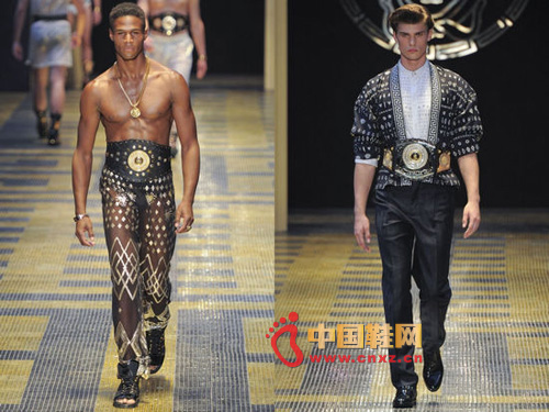 每一季的男裝周上,必然會出現幾個華麗過頭的設計。在Donatella Versace的帶領下,上演了一出T臺拳王參加時尚派對的恐怖輕喜劇。先是象征一代拳王的鑲鉆腰帶,散發出金燦燦的光芒;配套著拳擊手披風外套,點綴上幾何回字圖騰,頗有點埃及法老的韻味;時隱時現的透明蕾絲長褲,蓋不住男模們性感的小翹臀;至于有網狀結構的性感三角內褲。