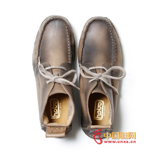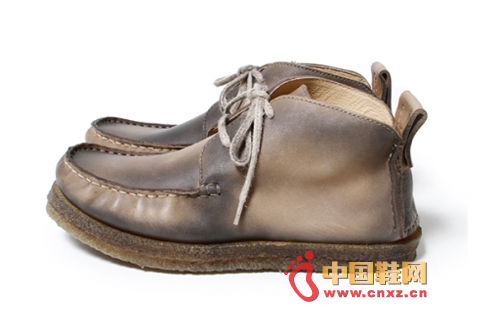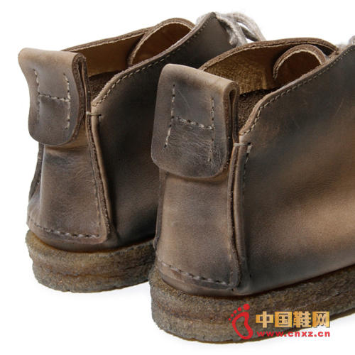 這款Moccasin Boots十分有趣,雖然名字叫Moccasin,但鞋型更像是Manhunt Boot和Desert Boot的合體,最大的特點在于鞋身用上了特殊制造的油革,高難度的煙熏做舊讓鞋子看上去有如使用多年的色澤與臟污,而且不僅鞋身,連生膠鞋底也同樣采用做舊處理,讓鞋子“舊”得渾然天成。
