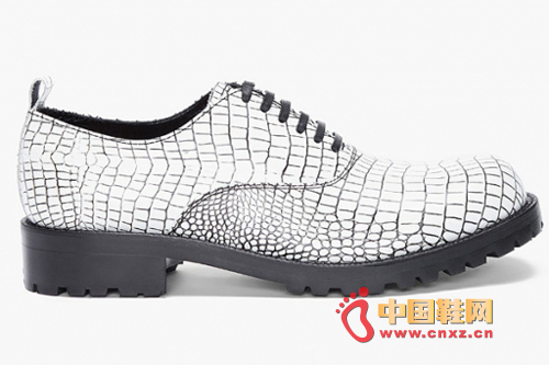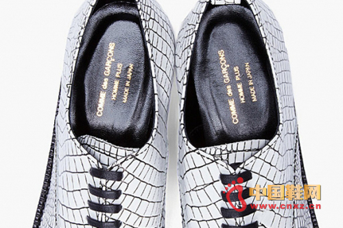 此次的皮鞋以類似鱷魚皮樣式的花紋壓制在鞋身上方,讓整雙皮鞋散發出濃厚的奢華感覺,但是自古就愛搞東搞西的CdG自然不能簡單的用的設計就交代了,所以即使是鱷魚皮,也并沒有采用我們經常見到的黑色、棕色的等顏色效果,反而是以十分分明的黑白色打造,讓皮鞋更顯一絲玩味。