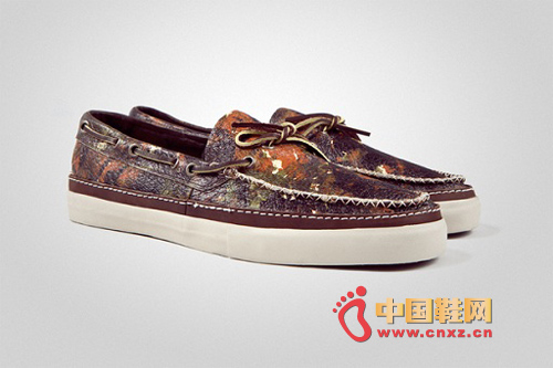 在設計上,Brush Camo這個系列的產品明顯帶有傳統滑板鞋的影子。材料方面,鞋身以及鞋底都采用了老牌皮革廠商Horween的優質皮革。除了正常的皮革紋理外,鞋身的皮革還擁有迷彩的印花以及油漆潑墨的工藝。此外,鞋身的白色交叉縫線也為這個系列的鞋款帶來了非常吸引人的元素。