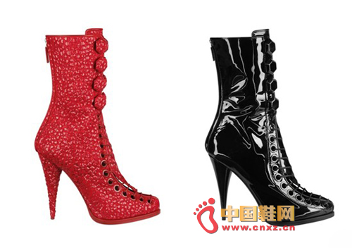 中國鞋網9月29日訊,打造紀梵希2012秋冬成衣系列之際,潛水和滑雪運動成為了Riccardo Tisci的兩大靈感之源。本季鞋履以尖頭設計、細高跟和十字系帶再現了滑雪靴的動感風情,羊毛、天鵝絨、啞光黑色皮革或漆皮……多種材質各具特色,最引人矚目的則是綴有手工鑲嵌的亮片和圓寶石的紅色高跟中靴。