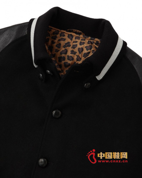 中國鞋網10月19日訊,之前在Black Sense新聞中,這款棒球夾克便以亮相,而它就是由SOPHNET.與uniform experiment這倆家同根品牌聯袂推出,從外在看,設計上與大多棒球外套相同,選用了羊呢面料搭配皮袖,不過若你細心發現的話,其實它還有很多特點,比如內里的豹紋圖紋,活是衣袖處的鉚釘設計,都為其加分不少,另外,也于袖口、領子處添加了白條螺紋,視覺效果更具層次感,非常適合那些喜歡簡約但性格中又略帶悶騷的朋友們購入哦!