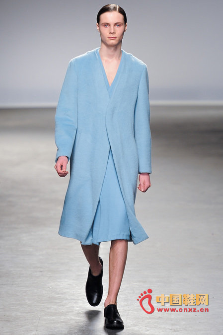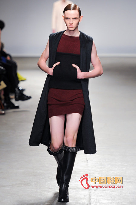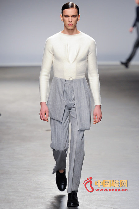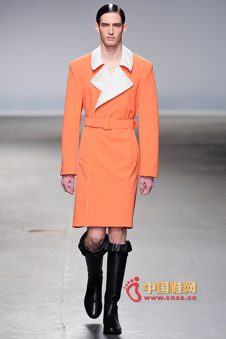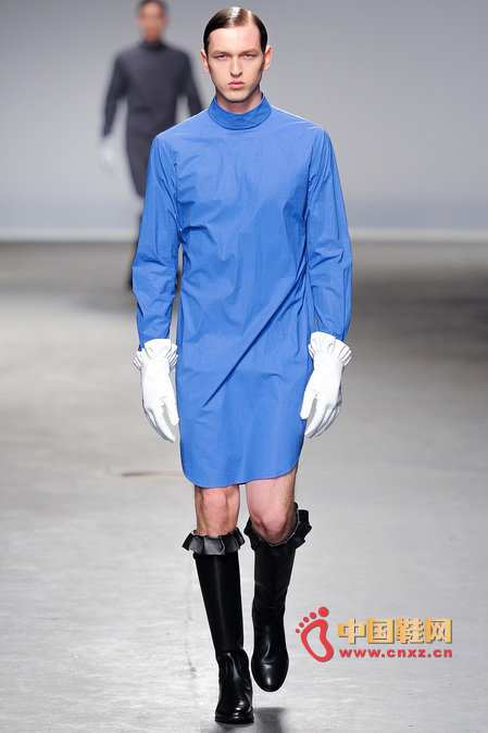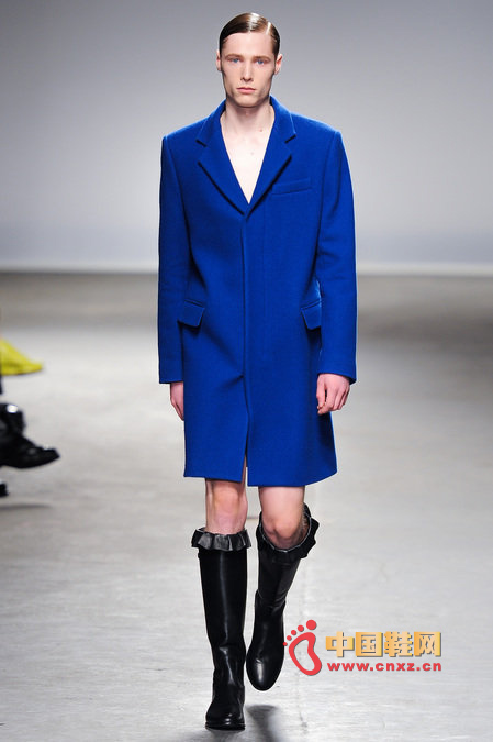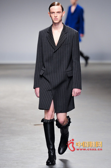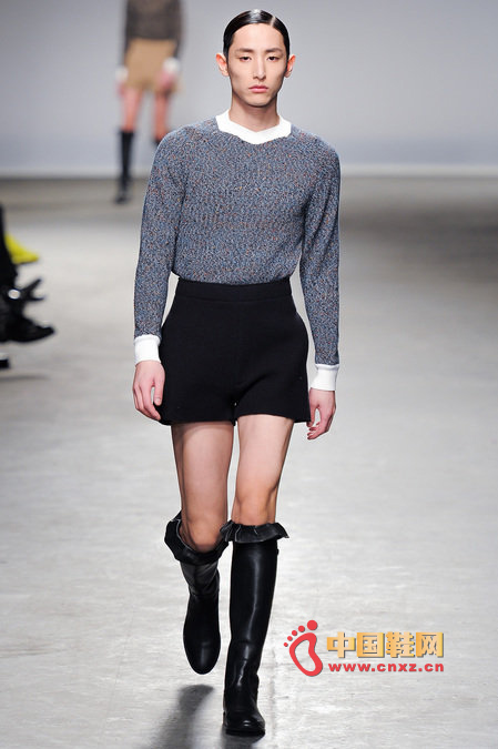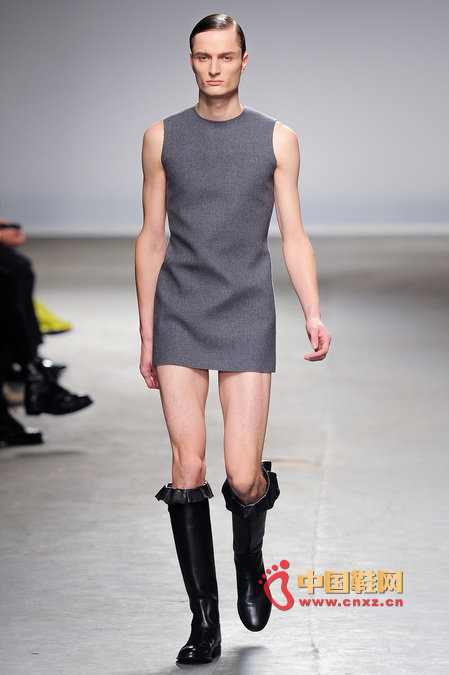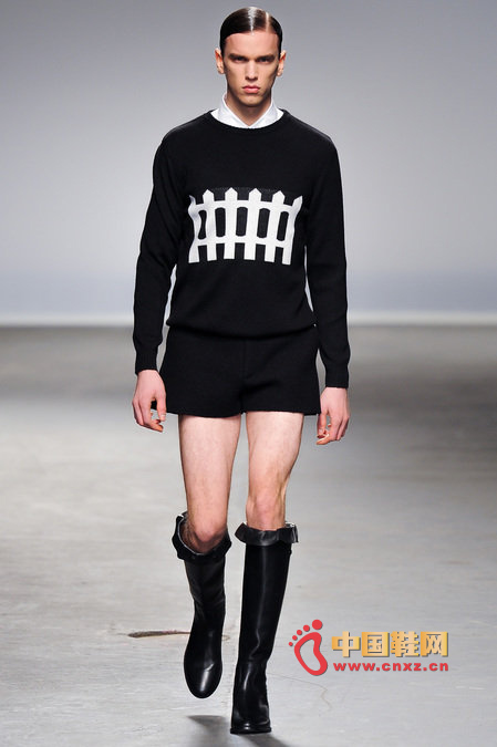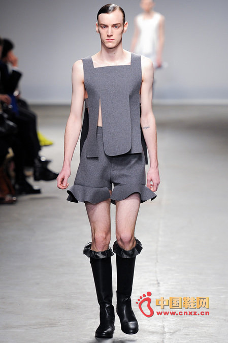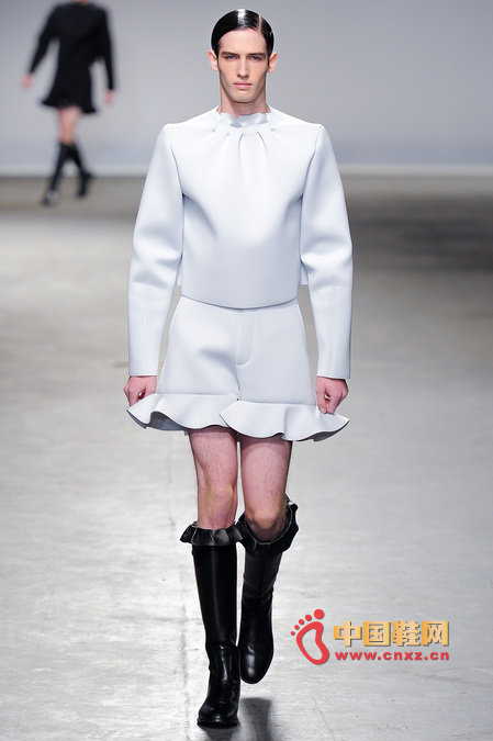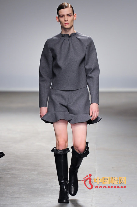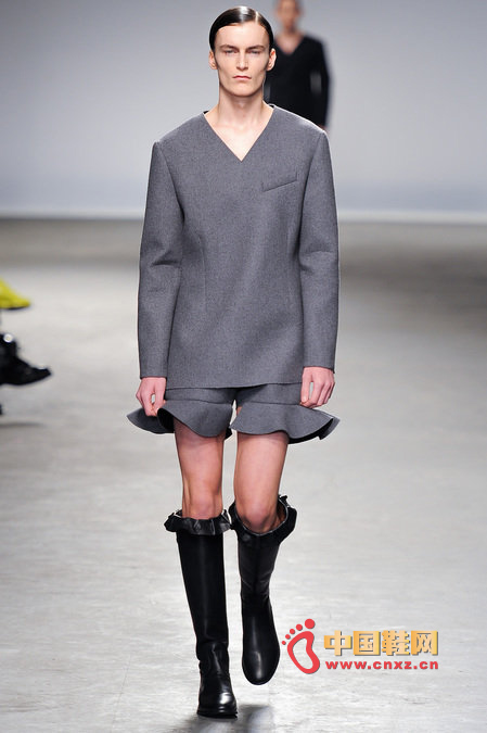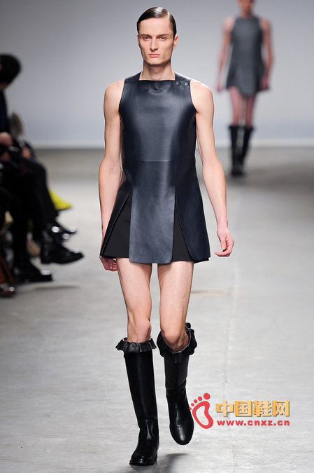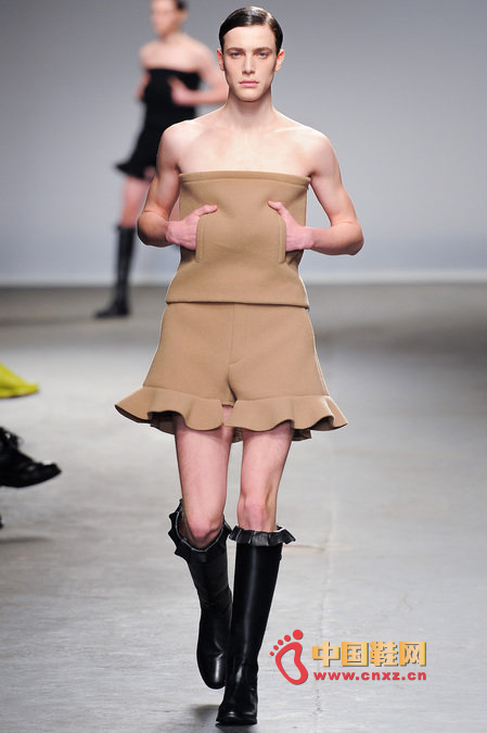 中國鞋網1月10日訊,顛覆傳統審美觀的J.W. Anderson 2013秋冬男裝秀,與其說是融入了女性元素,不如說是一場徹徹底底的女裝風格秀。荷葉邊的皮長靴、荷葉邊的超短褲、荷葉邊手套、帶口袋小抹胸、緊身連衣短裙、緊身皮上衣,Anderson在2013秋冬系列之中依舊堅持著這種反中性化的中性化矛盾理念。J.W.Anderson 連著兩季的男裝都很特別,或許是聽說女人穿男朋友的衣服會很性感,所以這些是給男朋友的女朋友設計的?