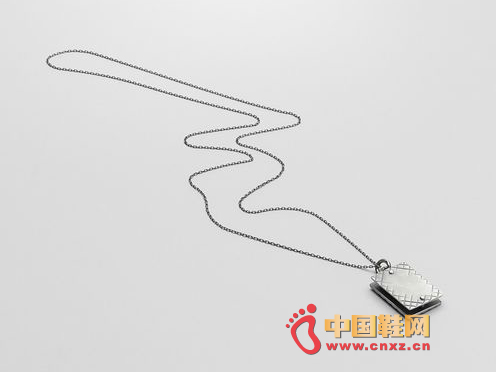 編織氧化銀吊墜,吊墜由兩個旋轉(zhuǎn)長方形銀質(zhì)部件組成,自上而下懸掛在細(xì)鏈上。吊墜前側(cè)鐫刻標(biāo)志性編織圖案。后側(cè)采用獨(dú)特的鐫刻漸變效果。