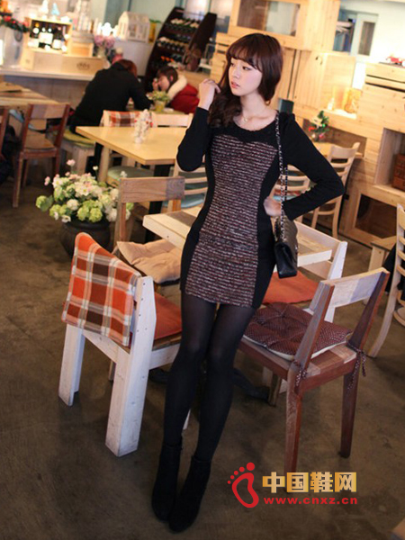 修身款拼接連身裙,設計很別致的一款,黑色的包邊設計,很好的修飾了身形,營造出超級修身顯瘦的整體感。