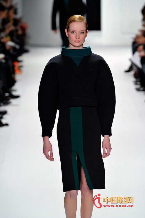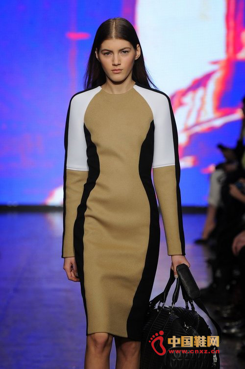 在拼接這一趨勢主導之下,結構感的拼接連衣裙在本季依然流行。Lacoste采用了本季新型的圓滑肩線,醒目的黑白灰及亮綠色拼接出運動款的雕塑風格。而DKNY更趨緊身,側身的黑色拼接凸顯曼妙身材。
