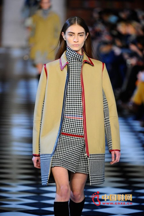 這一單品也可以看作是對拼接趨勢的延伸,在下擺處進行混搭面料的拼接將是下一季外套重要的元素。外套的款式是簡約或箱式的,對比感的面料拼接為款式帶來濃郁的時尚氣息。可以如Thakoon將皮草同粗花呢混搭,或者如Tommy Hilfiger將平整的粘合面料同傳統的格子混搭,內外呼應,并結合皮革滾邊,打造出獨特的面料混搭對比效果。