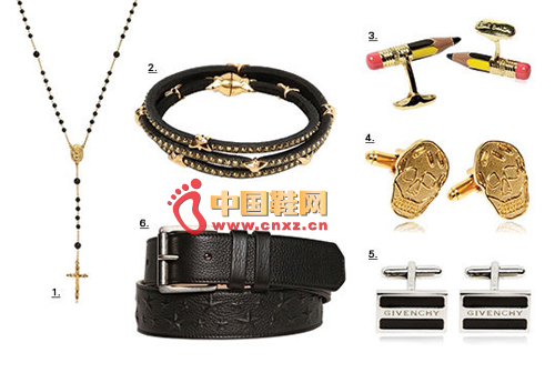 每個男人的心底都有著一股搖滾的不羈與灑脫,這些象征搖滾精神的黑金配飾將是你打動他的最佳禮物。Dolce & Gabbana十字架項鏈(圖1,2700元),Tomasz Donocik星星手鏈(圖2,3024元)和Alexander McQueen金色骷髏頭袖扣(圖4,900元),有種哥特式的神秘感,令人著迷。Jimmy Choo星星壓花皮帶(圖6,3144元)和Givenchy黑銀袖扣(圖5,1860元),則是走極簡風男士的最愛。另外,造型獨特的Paul Smith鉛筆袖扣(圖3,849元)也是讓他surprise一下的好選擇。
