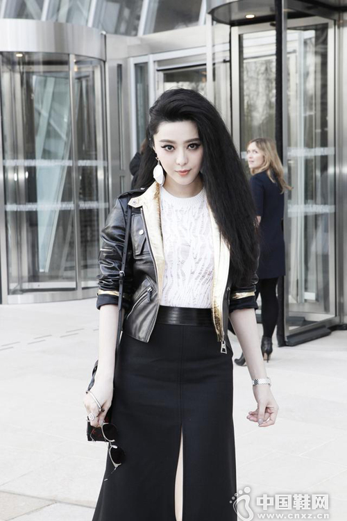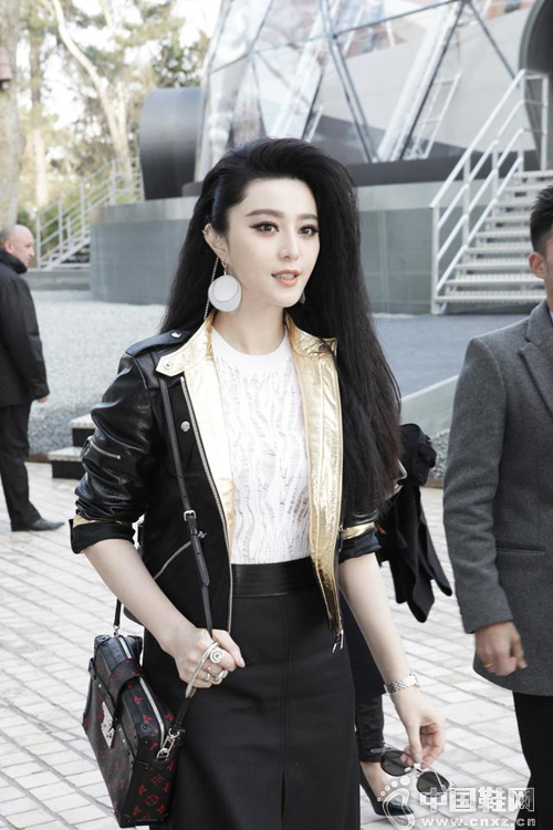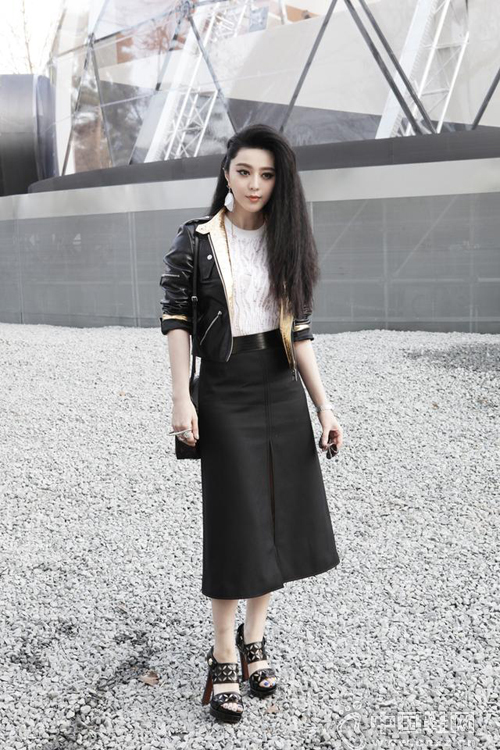 來看看范冰冰今天的看秀LOOK,側梳的一頭玉米須長發,LV不規則層疊吊墜耳飾配對,身著短款黑色包金邊皮夾克內搭白色半透視針織衫,黑色高腰開叉裙配粗跟鞋,手上的戒指和腕間鉆石表都來自蕭邦,靠著若隱若現的性感謀殺不少底片。不管是來“收妖”還是來Social,骨子里就透著酷勁范爺還是那個范爺!(合作媒體: )