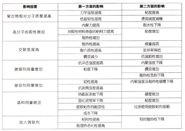 為了使膠粘劑具備綜合的力學性能,人們研究出了各種成分復雜的配方,以適就不同材料,不同場合的需要.影響膠粘劑力學性能的各種因素非常復雜,為了清楚起見,可把這些因素簡單粗略地加以歸納,見下表: