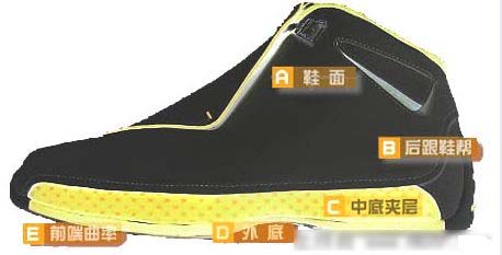 Upper——鞋面。球鞋覆蓋住腳上表面的部分。過去鞋面通常用皮革或織物制成,而現在更高科技含量的合成纖維織物和材料已經被廣泛的應用到鞋面制造工藝中了。