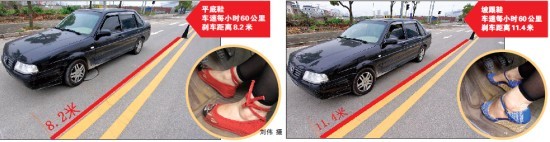 換上8厘米高的坡跟鞋后,同樣動作,剎車距離為11.4米。經驗十足的女司機稱,有跟的鞋感覺踩剎車沒有平底輕松。