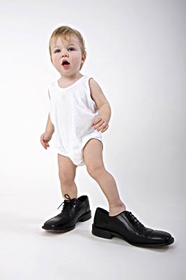 每隔大約二星期,就要注意寶寶的鞋是不是太小了。你可以讓小寶寶坐下來,摸摸看大趾頭離鞋面是否還有半公分到1公分的距離,這樣小寶寶每次邁開步伐向前走時,大趾頭往前伸展才有足夠的空間。而太大的鞋子容易絆腳。