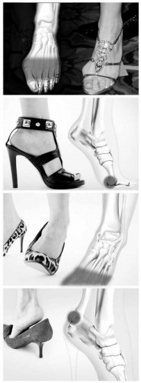 【中國鞋網-鞋與生活】穿高度適當的高跟鞋,就像在腳底墊起一個人造足弓,可令腿部內側的肌肉更結實,不但能夠預防肌肉及關節損傷、減輕走路的疲勞感,還可令身體保持挺直,增添體態美。而鞋跟的增高要有限度,以2—3厘米最為適宜,太高將損害腳的健康。右圖腳骨上的陰影處,將向您“述說”,高跟鞋穿不對,將傷害腳的哪些部位。