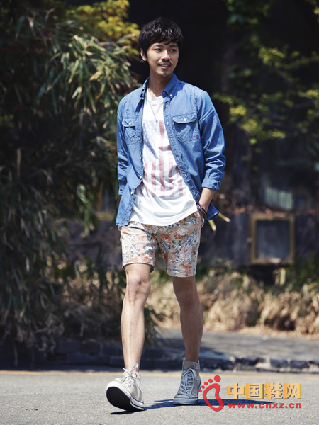 簡單的牛仔襯衫,自然水洗處理,顏色很帥氣。內搭美國國旗圖案的T恤和獨特花朵圖案的短褲,穿出休閑感。