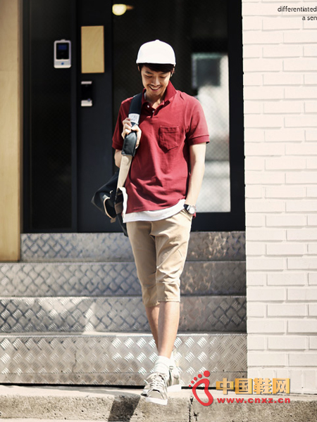 簡單的酒紅色POLO衫, 自然簡單的版型,搭配上膝蓋褶皺設計的中褲,加上棒球帽和休閑的單肩包搭配,休閑又有型。