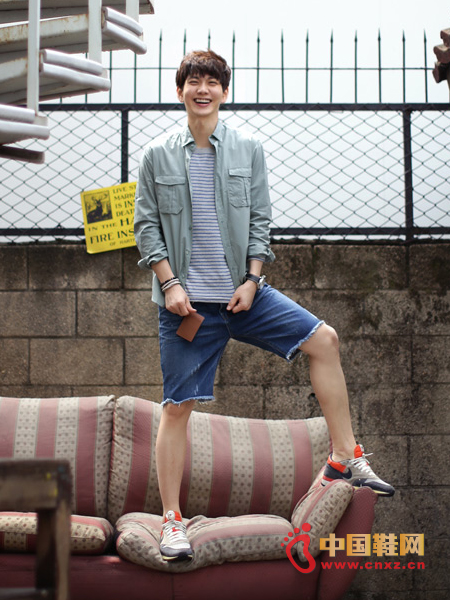 懷舊色調的襯衫,版型寬松舒適,不對稱的衣擺設計,很獨特,內搭條紋T恤和充滿懷舊氣息的牛仔短褲,給造型平添了懷舊氛圍。