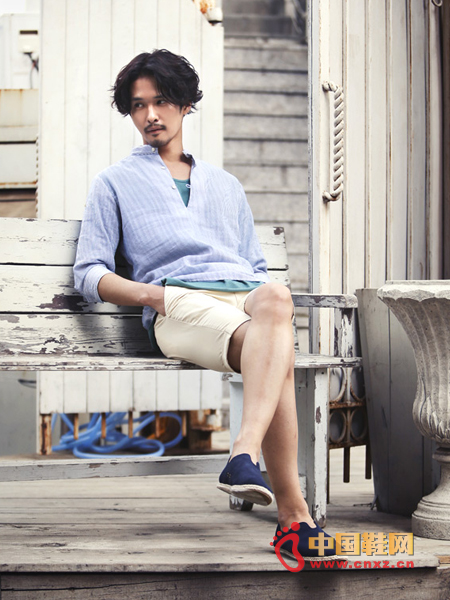 紐扣半開襟的襯衫,材質輕薄,有透氣性,海軍藍色調搭配上姜黃色修身短褲,展現出休閑活力的姿態。